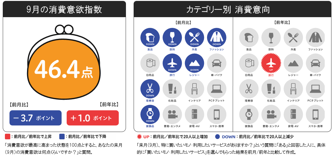 9月の消費意欲指数は46.4点。前月比-3.7ポイント、前年比+1.0ポイントと、ほぼ前年並みとなりました。