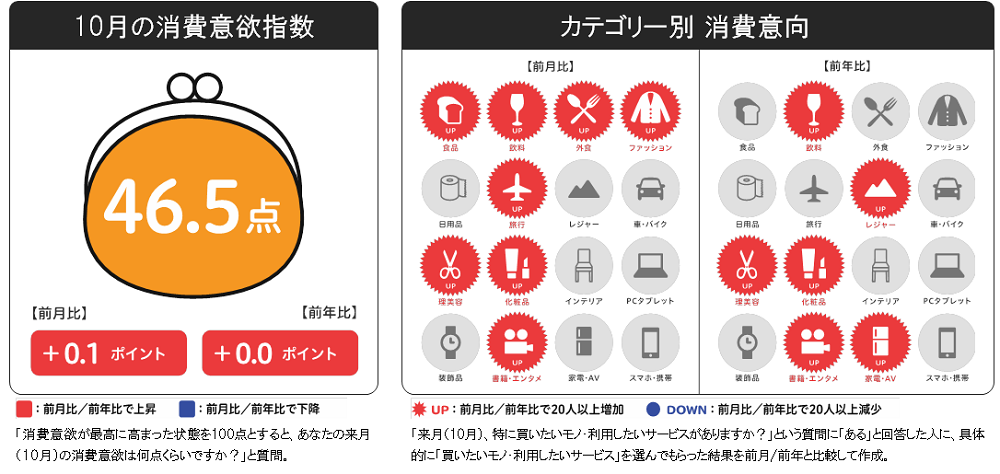 10月の消費意欲指数は46.5点。前月比+0.1ポイント、前年比+0.0ポイントと、ほぼ横ばいとなりました