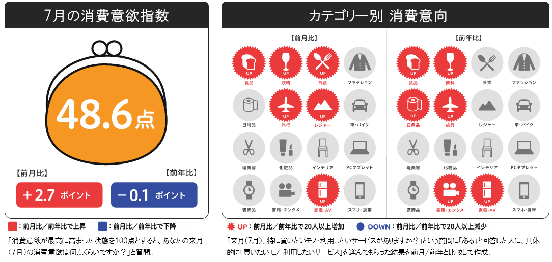 7月の消費意欲指数は48.6点。前月比+2.7ポイント、前年比-0.1ポイントと、ほぼ前年並みとなりました。