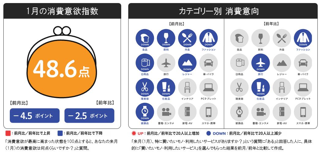 1月の消費意欲指数は48.6点。前月比-4.5ポイント、前年比-2.5ポイントと、前年比・前月比ともに低下しました。