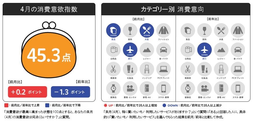 4月の消費意欲指数は45.3点。前月比+0.2ポイント、前年比-1.3ポイントと、前月からは横ばい、前年からはやや低下しました。