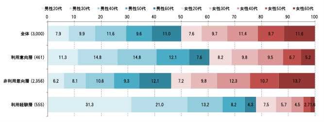 - 利用意向層の内訳を性年代別に見ると、男女比は6:4で、男性30代・40代が最も多く、共に14.8%となりました。