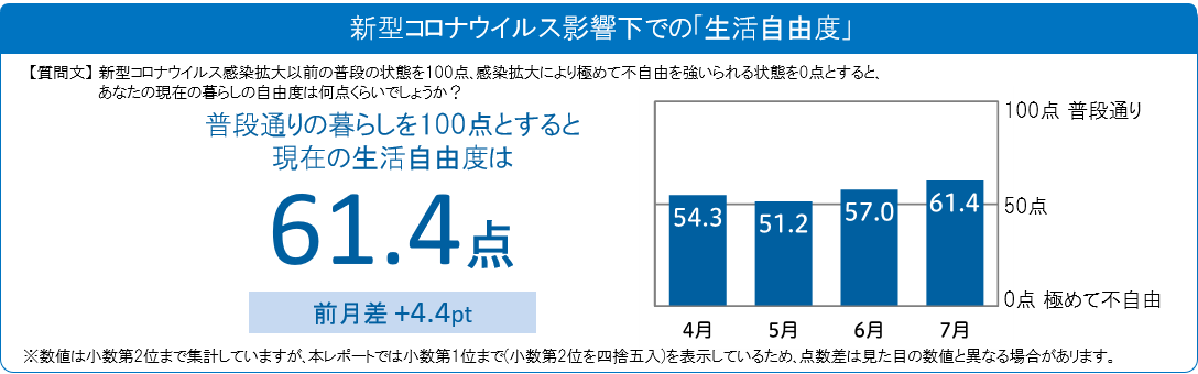 感染拡大以前の普段の状態を100点としたとき、現在の状況下における「生活自由度」が何点くらいかをきいたところ、61.4点となりました。6月19日付で都道府県外への移動制限が解除されたこともあり、6月調査の数値から4.4ポイント上昇し、4回の調査で最高値となりました。