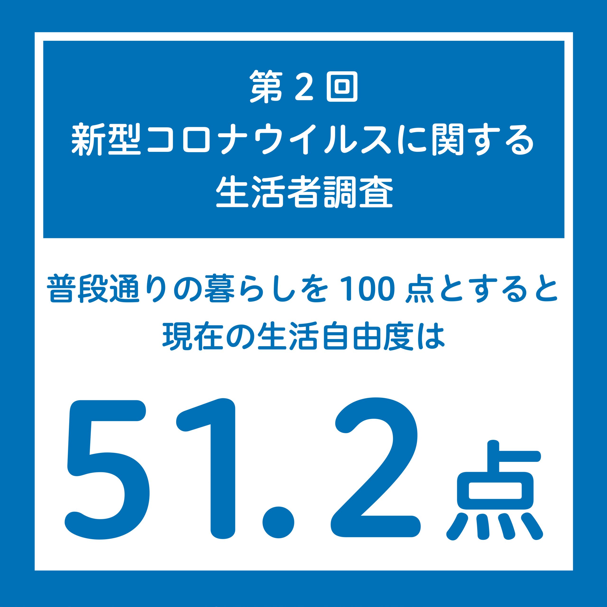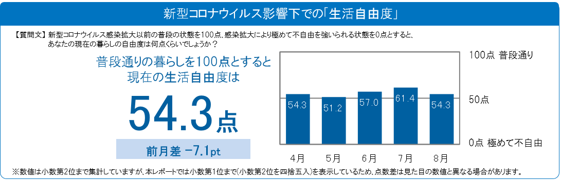 感染拡大以前の普段の状態を100点としたとき、現在の状況下における「生活自由度」が何点くらいかをきいたところ、54.3点となりました。7月から7.1ポイントの下降。4月と同じ数値となりました。7月から8月にかけ感染者が再び急増。連日の感染拡大報道、東京都の営業自粛再要請(7/30発表、8/3から)、愛知県の緊急事態宣言(8/5発表、8/6から)が出る中、 6月以降高まってきた生活自由度は減少に転じました。