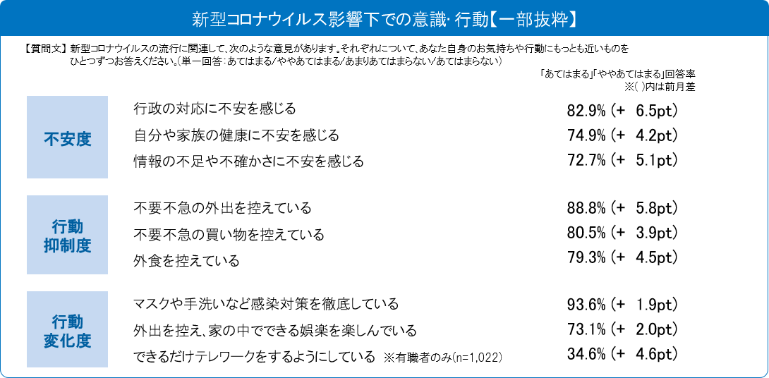 また新型コロナウイルス感染拡大に伴う不安や、抑制している行動、変化している行動など41項目について尋ねたところ、【不安度】はすべての項目で7月調査より上昇。経済、健康不安だけでなく、「行政への不安」(82.9%、6.5ポイント増)、「情報の不足や不確かさへの不安」(72.7%、5.1ポイント増)も高まりました。【行動抑制度】も、「外出を控えている」(88.8%、5.8ポイント増)ほか、すべての項目で増加。また【行動変化度】は各項目の増減はまちまちですが、「マスク、手洗いなど感染対策の徹底」が(93.6%、1.9ポイント増)とさらに高まり、「外出を控え、家の中でできる娯楽を楽しんでいる」(73.1%、2.0ポイント増) など、屋内行動が再び増加。6月以降、行動抑制は徐々に緩み、「家から外へ」シフトがみられましたが、再び抑制が高まり、「外から家へ」の動きがうかがえます。