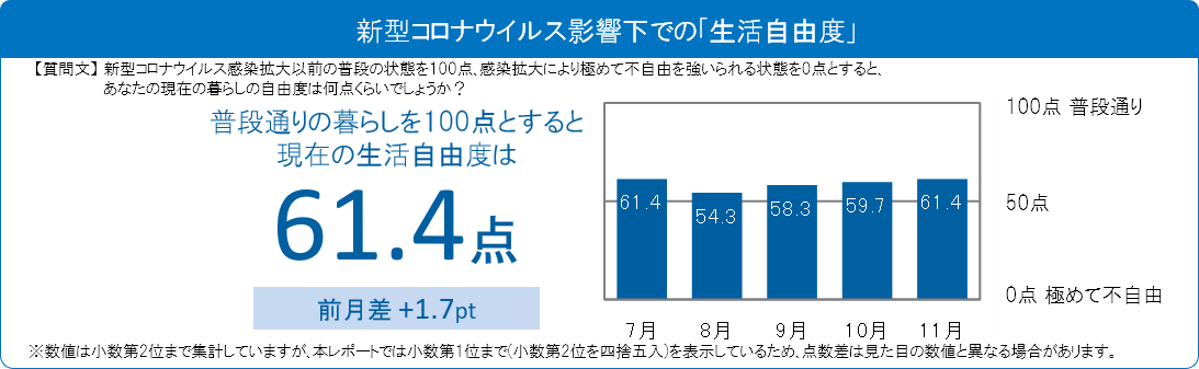 感染拡大以前の普段の状態を100点としたとき、現在の状況下における「生活自由度」が何点くらいかをきいたところ、61.4点と、10月からは1.7ポイント増加し、3か月連続で上昇。4月の調査開始以来、最高だった7月と同じ値となりました。