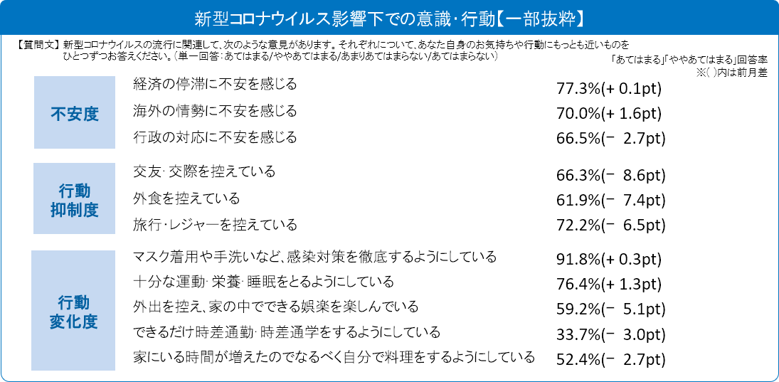 新型コロナウイルス感染拡大に伴う【不安度】は、前月から大きな変化はありませんが、【行動抑制度】は、前々月から3か月連続で全項目が減少。特に 「交友・交際を控えている」(66.3%、8.6pt減)、 「外食を控えている」(61.9%、7.4pt減)、 「旅行・レジャーを控えている」(72.2%、6.5pt減)の減少が目立ちます。