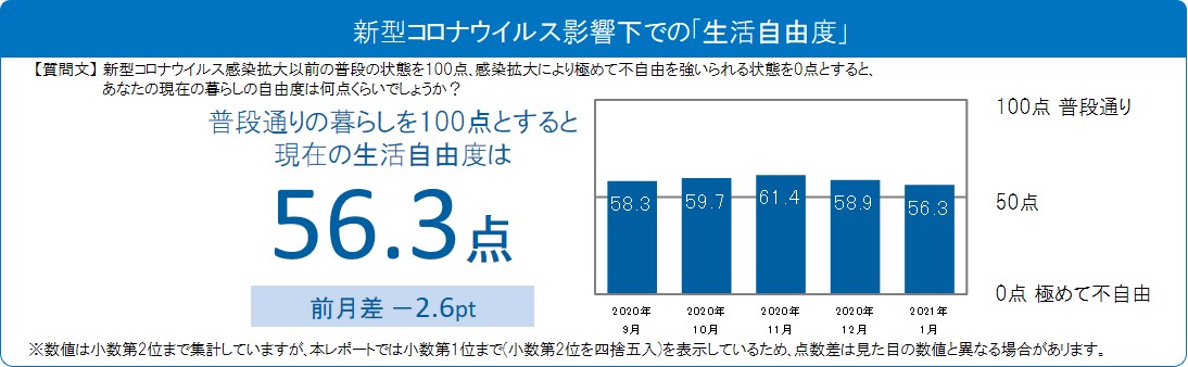 感染拡大以前の普段の状態を100点としたとき、現在の状況下における「生活自由度」が何点くらいかをきいたところ、56.3点と、12月からは2.6ポイント減少。2か月連続で減少となりました。