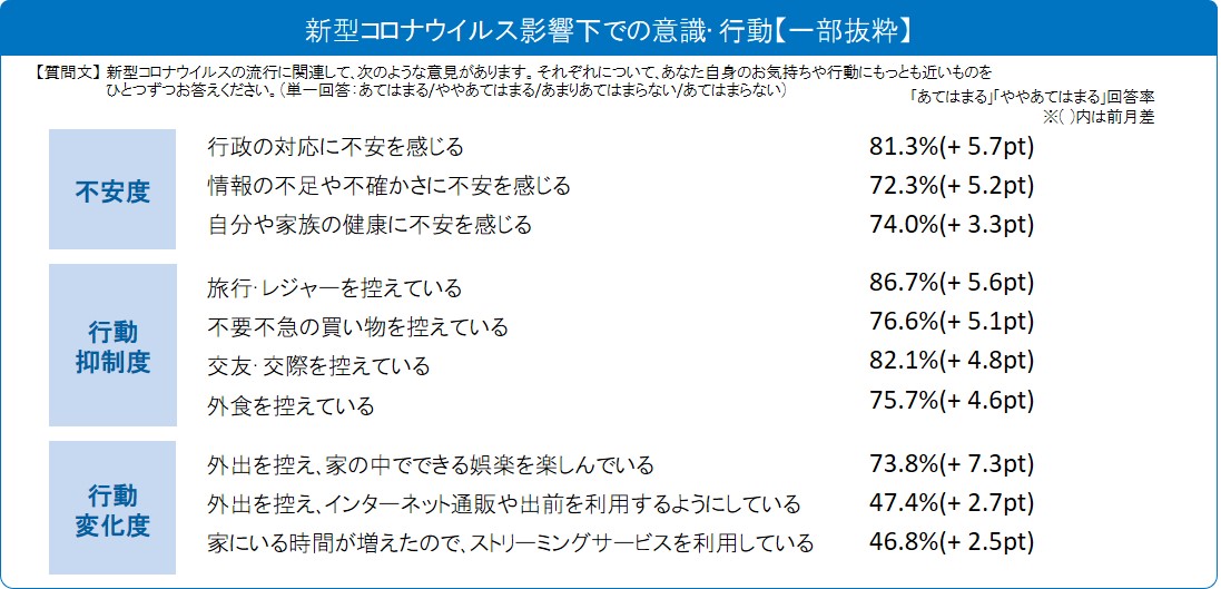 新型コロナウイルス感染拡大に伴う【不安度】は前月に続き、ほぼすべての項目で増加。今月も「行政の対応に不安」(81.3%、5.7pt増)、「情報の不足や不確かさに不安」(72.3%、5.2pt増)の2項目の増加が目立ちました。【行動抑制度】も前月同様、今月も全項目が増加。特に「旅行・レジャーを控えている」(86.7%、5.6pt増)、「不要不急の買い物を控えている」(76.6%、5.1pt増)が目立ちます。