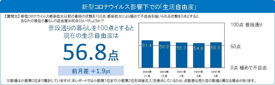 感染拡大以前の普段の状態を100点としたとき、現在の状況下における「生活自由度」が何点くらいかをきいたところ、56.8点と、2月からは1.9ポイント増加。3か月連続の減少に歯止めがかかりました。