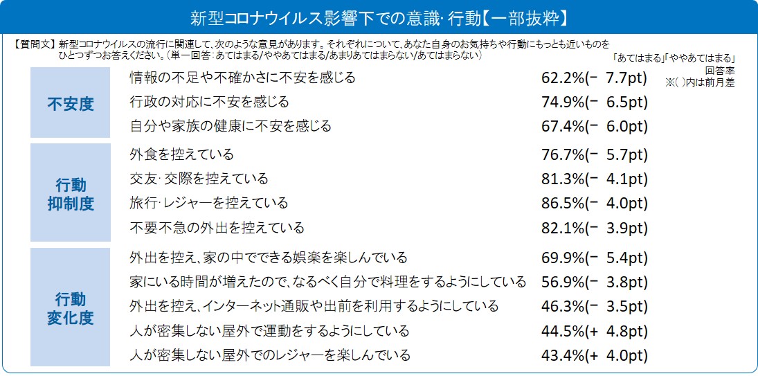 新型コロナウイルス感染拡大に伴う【不安度】は「情報の不足や不確かさの不安を感じる」(62.2%、7.7pt減)、「行政の対応に不安を感じる」(74.9%、6.5pt減)以下、全項目で減少。3か月連続で全項目が増加してきた【行動抑制度】も全項目で減少。特に「外食を控えている」(76.7%、5.7pt減)の減少が目立ち、「交友・交際を控えている」(81.3%、4.1pt減)、「旅行・レジャーを控えている」(86.5%、4.0pt減)と続きます。